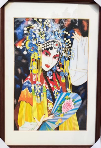 河北梆子花旦图是她最满意的代表作之一,亦是彰显河北地方传统文化特色的经典之作。这幅作品耗时近一个月完成,从眉眼细节到面部轮廓,全部通过掐丝、点蓝工艺呈现。因上色时颜料带水,极易出现串色问题,需要经过细致晕染、细心打磨、多次固色,最终将花旦的灵动与神韵刻画得淋漓尽致,成为掐丝珐琅工艺的经典展示作品。