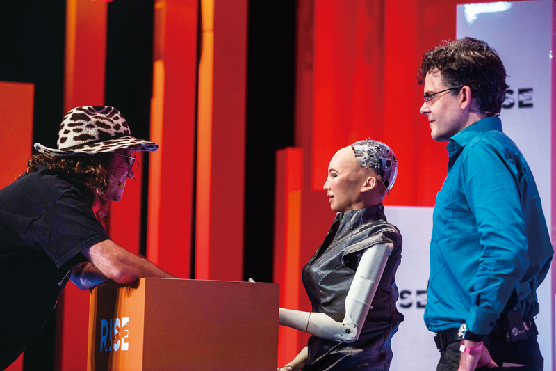 2017年10月,在沙特阿拉伯首都利雅得举行的“未来投资倡议”大会上,机器人索菲亚被授予沙特公民身份,她也因此成为全球首个获得公民身份的机器人。图为2018年7月10日,在香港会展中心,机器人索菲亚亮相主舞台。 ISAAC LAWRENCE/视觉中国