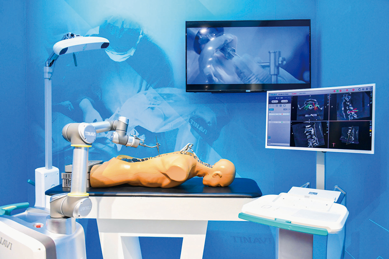 2018年11月22日, 在“伟大的变革——庆祝改革开放40周年大型展览”上,第三代国产骨科手术机器人“天玑”正在模拟做手术,它是国际上首个适应症覆盖脊柱全节段和骨盆髋臼手术的骨科机器人,性能指标达到国际领先水平。 麦田/视觉中国