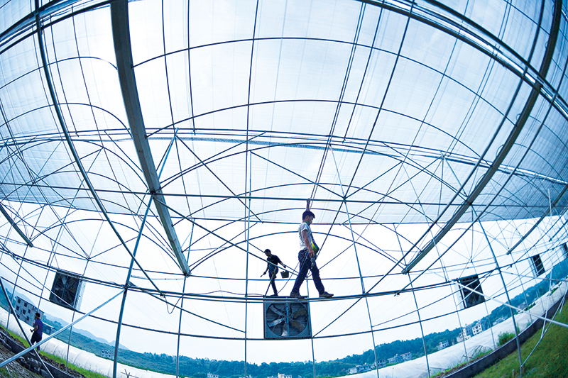 近年来,湖北省恩施土家族苗族自治州宣恩县大力发展“设施农业”,通过企业、合作社、家庭农场等将农民手中的土地进行流转,发展农业观光园和生态采摘园,为当地农民开辟一条产业脱贫的新路。图为宣恩县李家河镇二虎寨村,工人们在搭建温控大棚。 新华社记者 宋文/摄