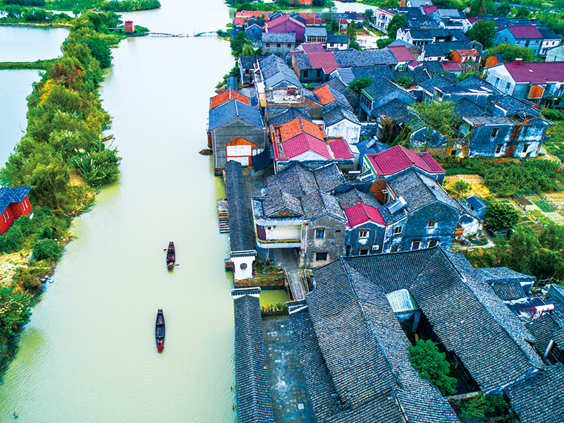 为了保护古村落,浙江省湖州市东林镇对泉家潭村的青石路面、古桥及多处古宅进行了修复改造,水乡古村成为当地美丽乡村的景观带。图为2018年10月10日,泉家潭村村民划着小船经过沿河长廊。 新华社记者 徐昱/摄