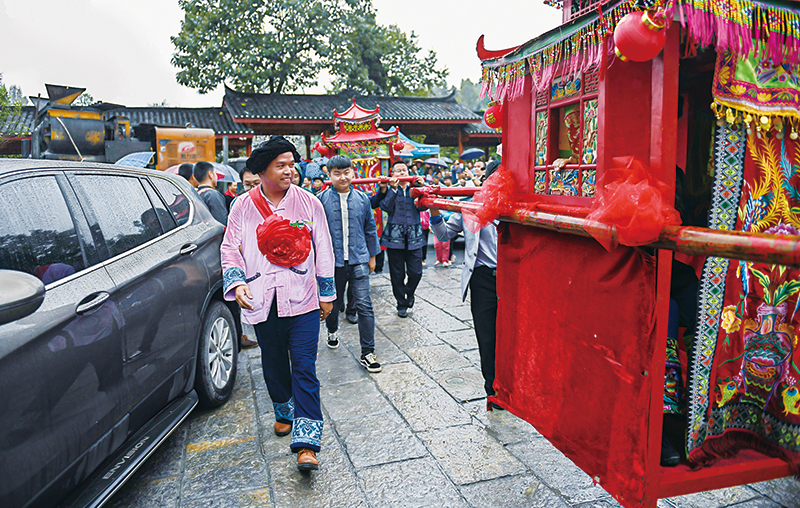 地处武陵山腹地的湖南省花垣县双龙镇十八洞村曾深陷贫困,2013年全村225户中有136户是贫困户,40岁以上的“光棍”有30多人。2013年11月3日,习近平总书记来到十八洞村考察,“同大家一起商量脱贫致富奔小康之策”,首次提出“精准扶贫”重要理念。2018年,已经脱贫的十八洞村人均纯收入达到12128元,在实践中探索出了一条脱贫与乡村振兴协同发展之路。 图为2018年9月24日,“脱贫”又“脱单”的十八洞村村民施六金引领娶亲队伍进入婚礼现场。 新华社记者 李尕/摄