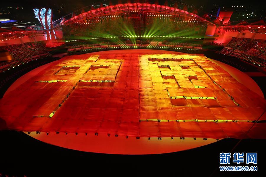 10月18日,第七届世界军人运动会开幕式在武汉体育中心举行。这是开幕式现场展示的“中国”两字。新华社记者 李尕 摄
