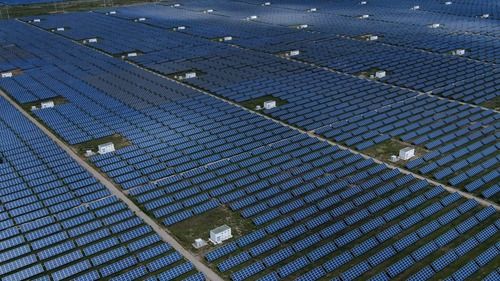 青海省海南藏族自治州共和县塔拉滩光伏电站(8月17日摄,无人机照片)。新华社记者 张龙 摄
