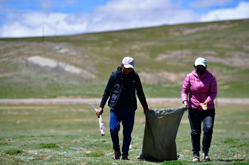 在青海省果洛藏族自治州玛多县玛查理镇噶丹村,生态管护员索南吉(右)与才让多杰在村子周边的草原上捡垃圾(8月19日摄)。新华社记者 张龙 摄