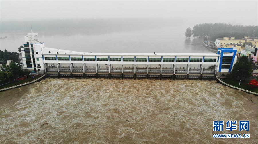 淮河王家坝闸开闸泄洪,洪水通过王家坝闸涌入蒙洼蓄洪区(7月20日摄,无人机照片)。新华社记者 黄博涵 摄