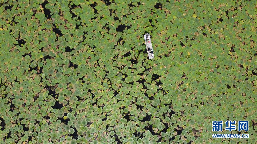 在位于蒙洼蓄洪区内的安徽省阜南县老观乡,村民在采收芡实(8月16日摄,无人机照片)。新华社记者 张端 摄