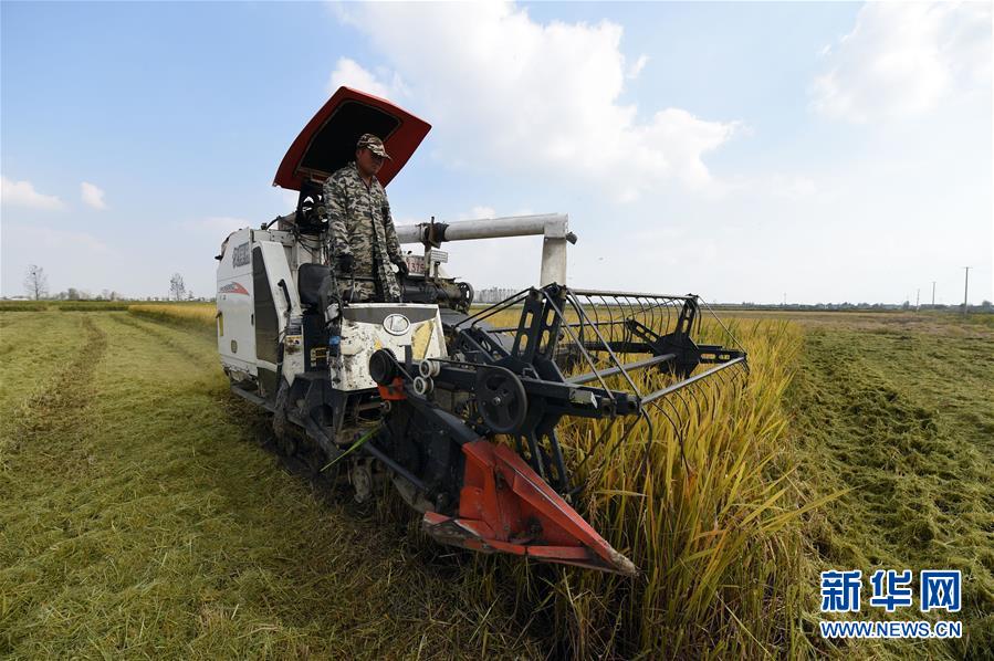 10月8日,在安徽省颍上县八里河镇,农民驾驶收割机收割水稻。新华社记者 周牧 摄