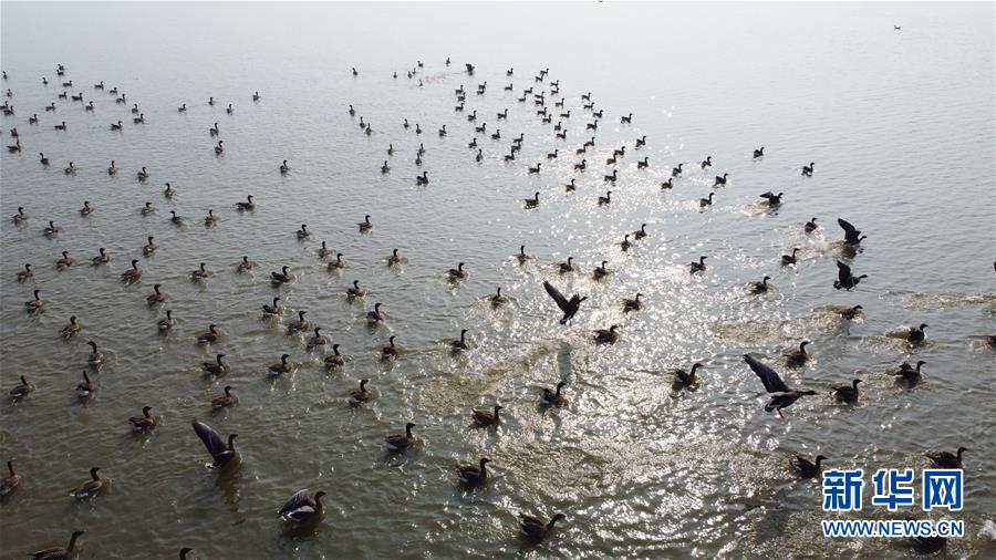 这是2019年12月15日在安徽省安庆市菜子湖湿地拍摄的候鸟(无人机照片)。新华社记者 张端 摄