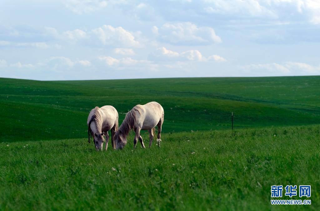 两匹马在锡林郭勒盟西乌珠穆沁旗白马繁育基地的草原上吃草(2020年6月28日摄)。新华社记者 贾立君 摄