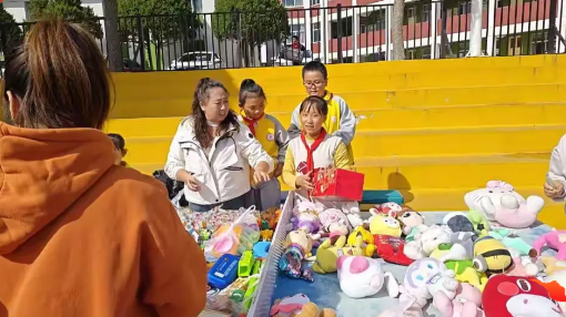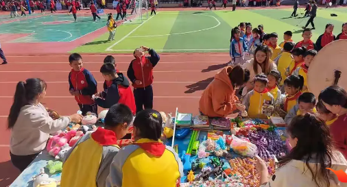 捐赠环节结束后,班级“首届跳蚤市场”在操场热闹开启。学生们化身“小小摊主”,将家中精心挑选的玩具、书籍、文具等物品一一摆放整齐,主动与前来“淘宝”的同学交流、议价。操场上人头攒动、热闹非凡,讨价还价声与欢笑声交织,孩子们在自主交易中体验分享的快乐,也学会了沟通与合作。