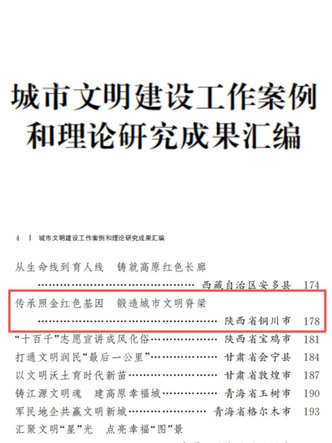 铜川市城市文明建设工作经验《传承照金红色基因 锻造城市文明脊梁》入选大会印发的工作案例汇编,全省仅两个地市工作经验在大会上作书面交流。