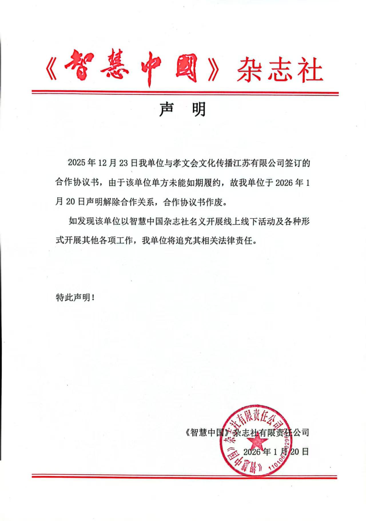 2025年12月23日我单位与孝文会文化传播江苏有限公司签订的合作协议书,由于该单位单方未能如期履约,故我单位于2026年1月20日声明解除合作关系,合作协议书作废。