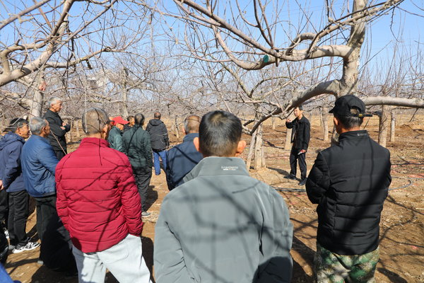 在彭镇赵塬村严塬组的活动现场,30余名周边果农围聚在果树旁,县果业发展中心高级农艺师王文围绕果树清园修剪、科学施肥、水分管理、倒春寒预防、病虫害防治五大核心环节,结合宜君县气候特点和苹果生长规律,进行了细致讲解和现场示范。从修剪枝条的角度力度到施肥的时机用量,再到倒春寒的应对措施,王文用通俗易懂的语言和直观的操作,让果农们听得懂、学得会、用得上。